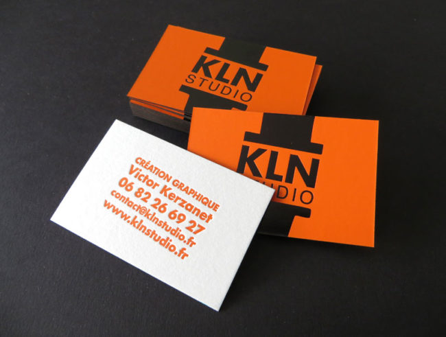 Impression : 1 marquage à chaud noir recto + 1 couleur en débossage verso Papier : orange 300 g + papier blanc 300 g Finition : couleur sur tranches Design : KLN studio
