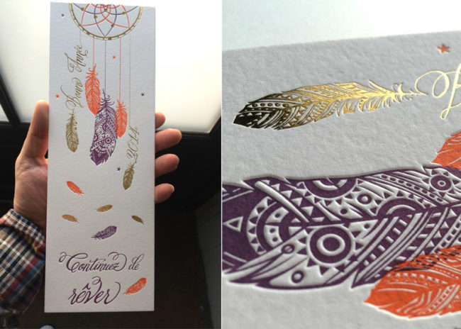 Impression : 2 couleurs en débossage + 1 marquage à chaud or recto seul Papier : Naturel 500 g Finition : couleur sur tranches Design : Sabrina Jarry