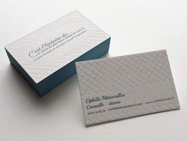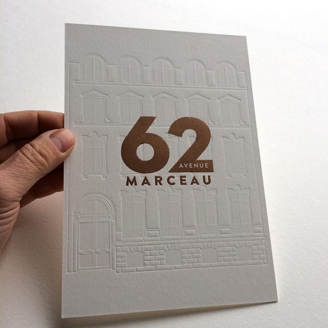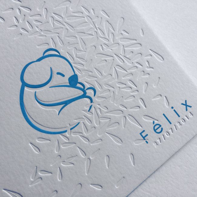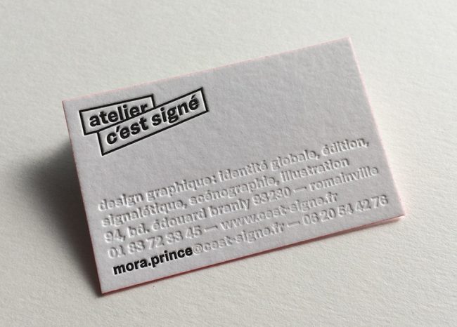 Impression : 1 couleur en débossage + 1 débossage pur recto seul Papier : naturel 500 g Finition : couleur sur tranches Design : Atelier c’est signé