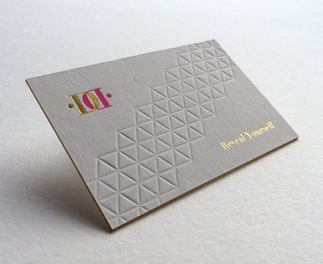 Impression : 1 débossage pur + 1 pantone cuivre métallisé recto/verso Papier : Bianco 2 x 300 g Finition : couleur sur tranches Design : Hello Elo