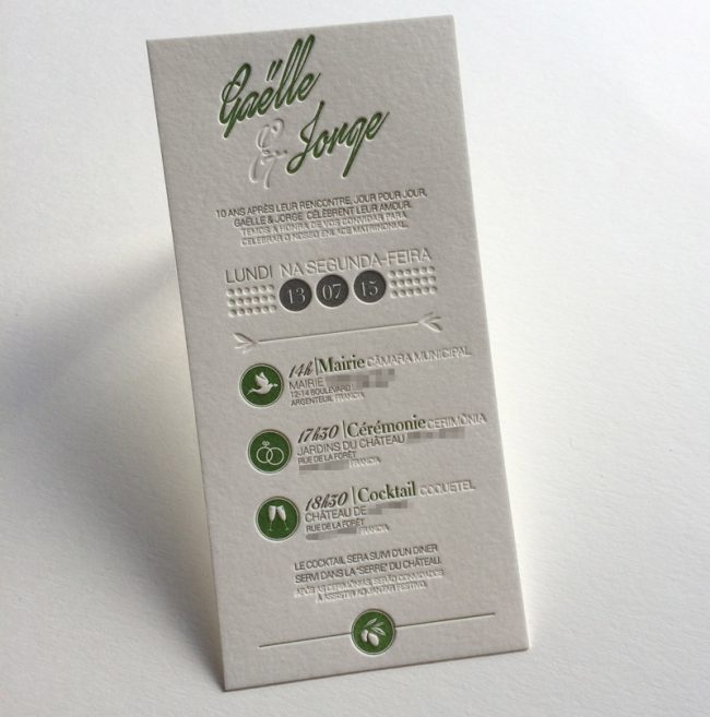 Impression : 2 couleurs en débossage + 1 débossage pur recto seul Papier : naturel 500 g
