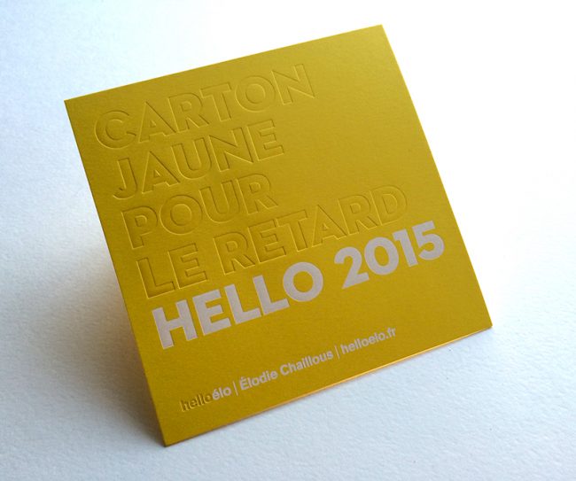 Impression : 1 débossage pur + 1 marquage à chaud blanc recto seul Papier : jaune 480 g Design : Hello Elo