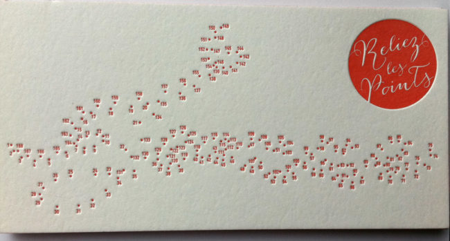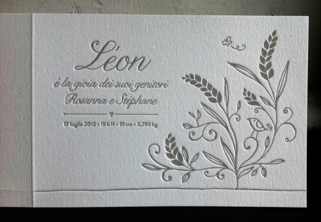 Impression faire-part 20 x 10 cm , débossage 1 couleur R° + rainage sur papier 300g. Design par Lise Batsalle.