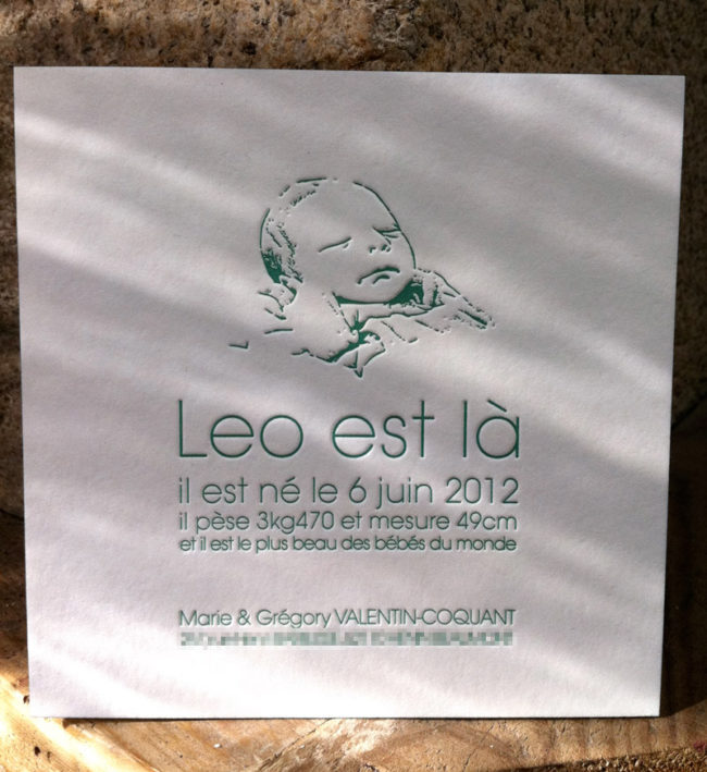 Impression faire-part 15 x 15 cm , débossage 1 couleurs R° + couleur sur tranches sur papier 500g. Design par Grégory Valentin.