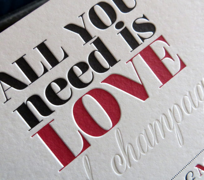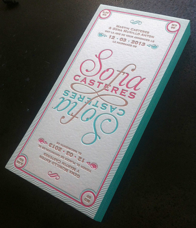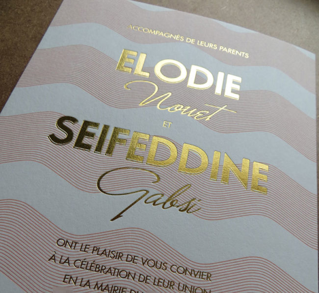 Débossage 2 couleurs R°+ couleur sur tranches sur papier 500g. Design par Margaux Queralt