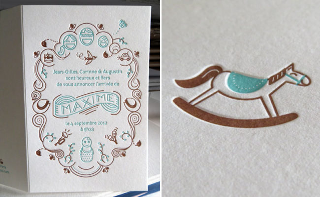 Débossage 2 couleurs et rainage sur papier 300g. Design par Fanny Parisot.