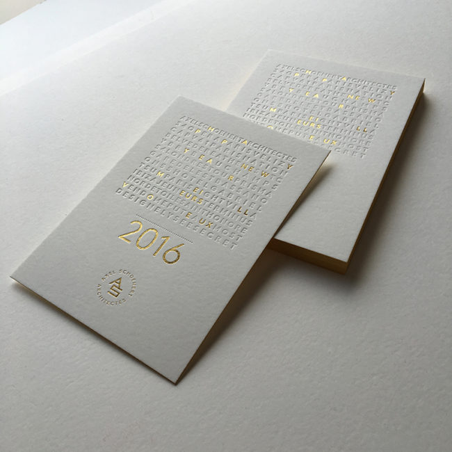 Impression : 1 marquage à chaud cuivre recto seul Papier : carton 400 g Design : Lise Batsalle