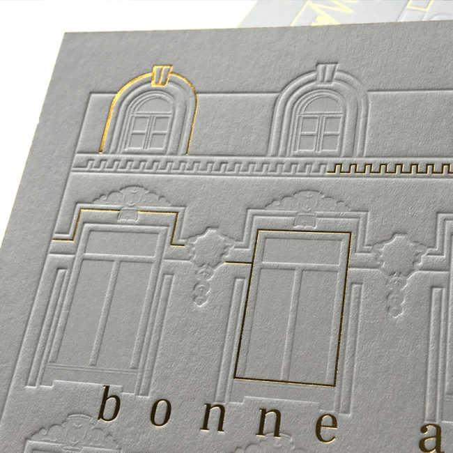Impression : 1 marquage à chaud or + 1 débossage pur recto / 2 couleurs en débossage verso Papier : 2 x 300 g