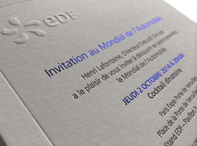Impression : 1 gaufrage recto + 1 débossage pur + 1 marquage à chaud bleu + 1 couleur en débossage recto seul Papier : 500 g
