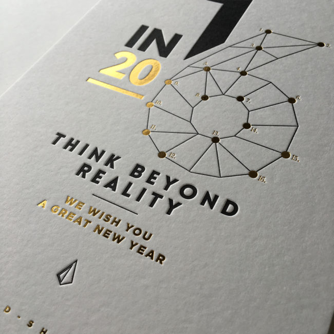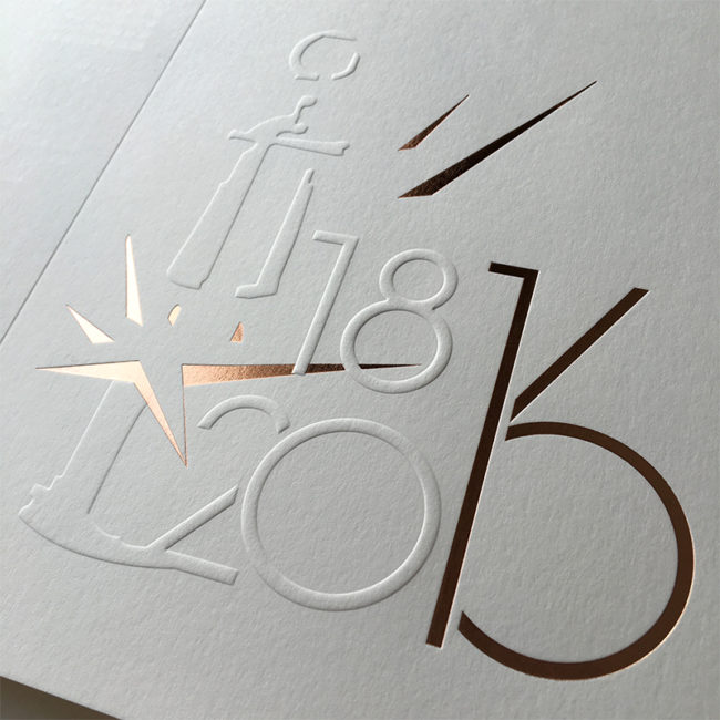 Impression : 1 gaufrage + 1 marquage à chaud cuivre recto / 1 débossage pur + 1 couleur Pantone métallisée cuivre verso Papier : 2 x 300 g