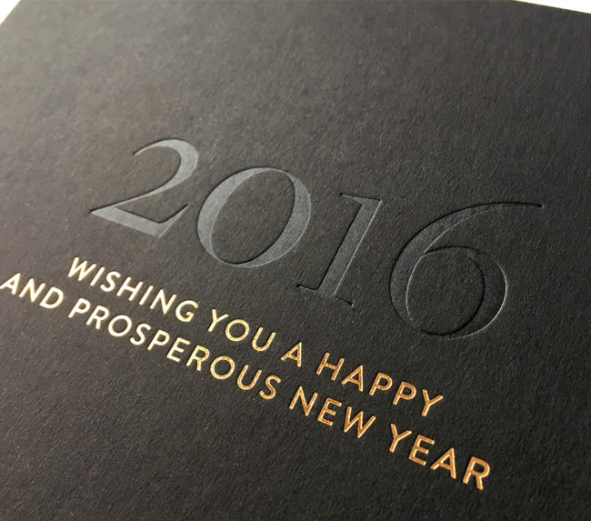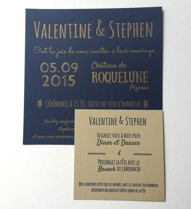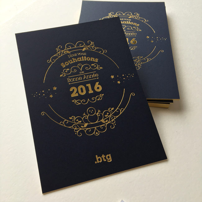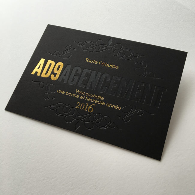 Impression : 1 débossage pur + 1 marquage à chaud or recto/verso Papier : papier noir + papier blanc 300 g