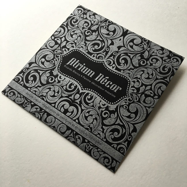 Impression : 1 couleur métallisée recto / 1 gaufrage + 1 couleur en débossage Papier noir 300 g + papier gris 300 g