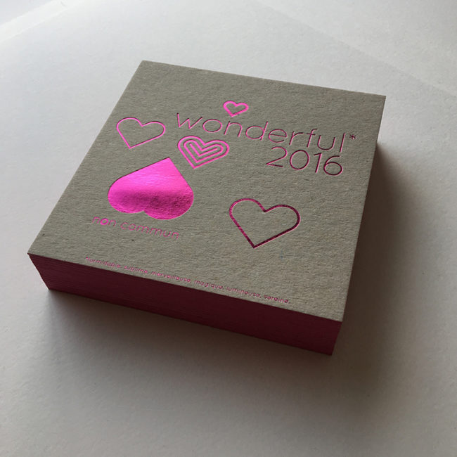 Impression : 1 marquage à chaud fuschia recto/verso Papier : carton 2 x 400 g Finition : couleur sur tranches