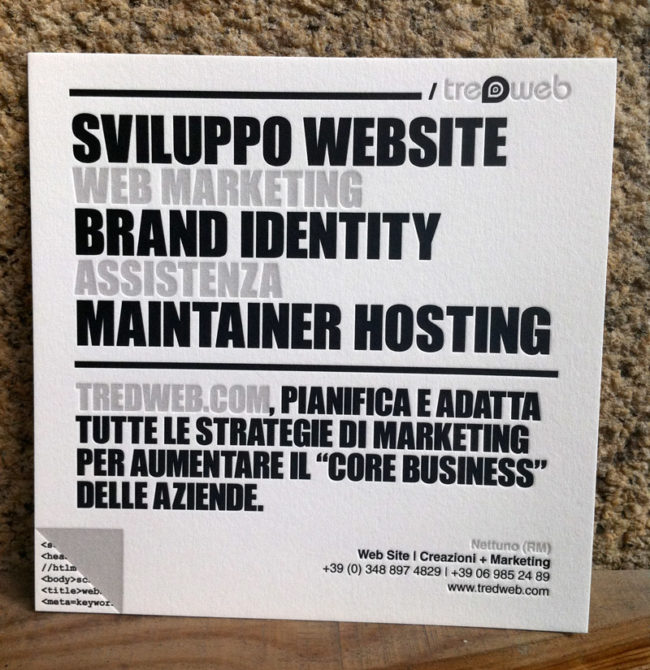 Carte de communication d’une boutique en ligne Impression : 2 couleurs en débossage recto seul Papier : Naturel 500 g Design : Severine Monsonego