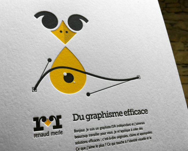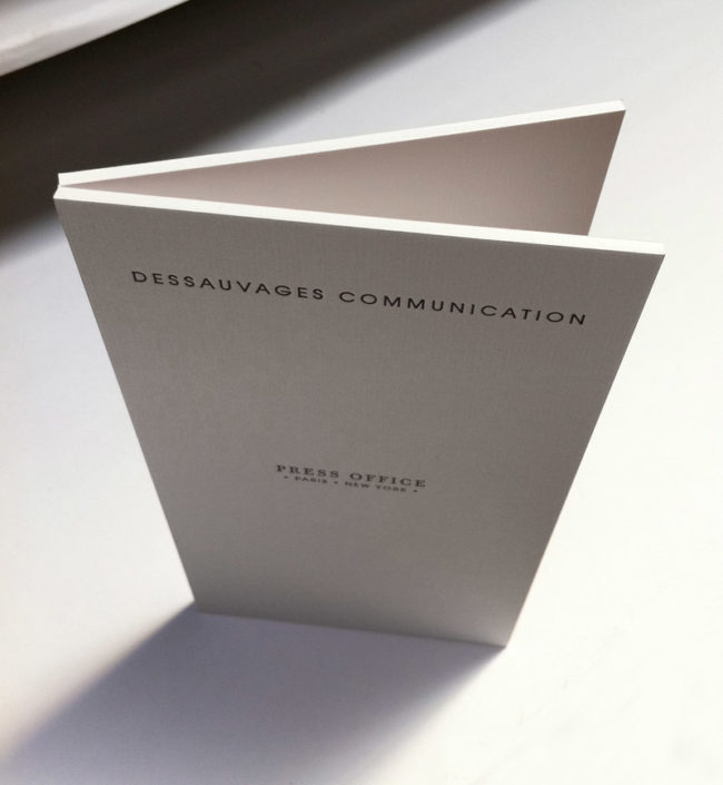 Impression plaquette 21 x 15 cm, débossage 2 couleurs sur papier 500 g, couleur sur tranches. Design par Renaud Merle.