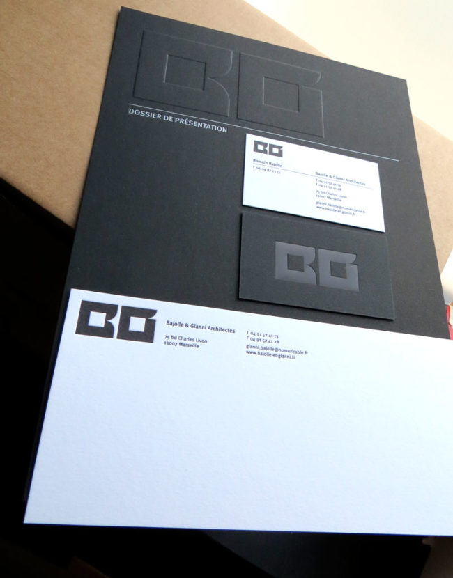 Carte de visite et de correspondance en débossage 1 couleur R°/V° et marquage à chaud noir sur papier 2x300g noir et blanc. Dossier de présentation débossage 1 couleur + gaufrage. Design par Valentin Bajolle.