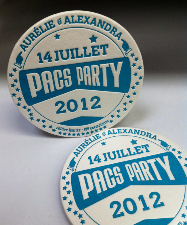 Impression sous-bock 9 cm, débossage 1 couleur R° sur papier duplex 2x500g. Design par Alexandra Poulain.